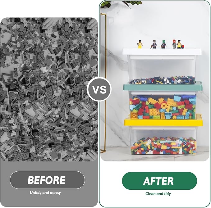 - ❤Perfect Solution for Craft Storage - Capacity: 17-quart. Each Dimensions: 14.37"L x 9.64"W x 6.69"H. If you need to organize art or craft supplies, this plastic storage bin is an ideal solution. Perfect for arts and crafts supplies, stationery, lego, kids building blocks,colorful beads, sewing art, fishing equipment, figurines, sewing kits, cardstock and other items are also great for this storage box.