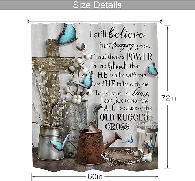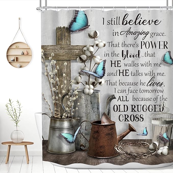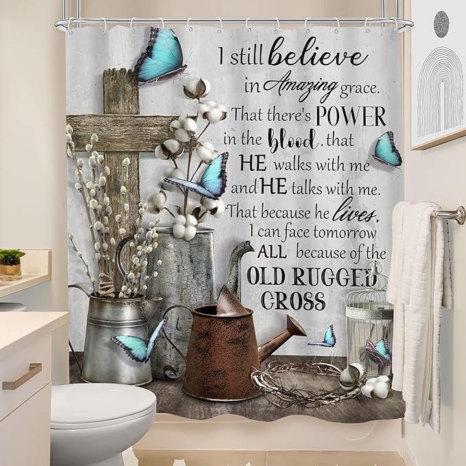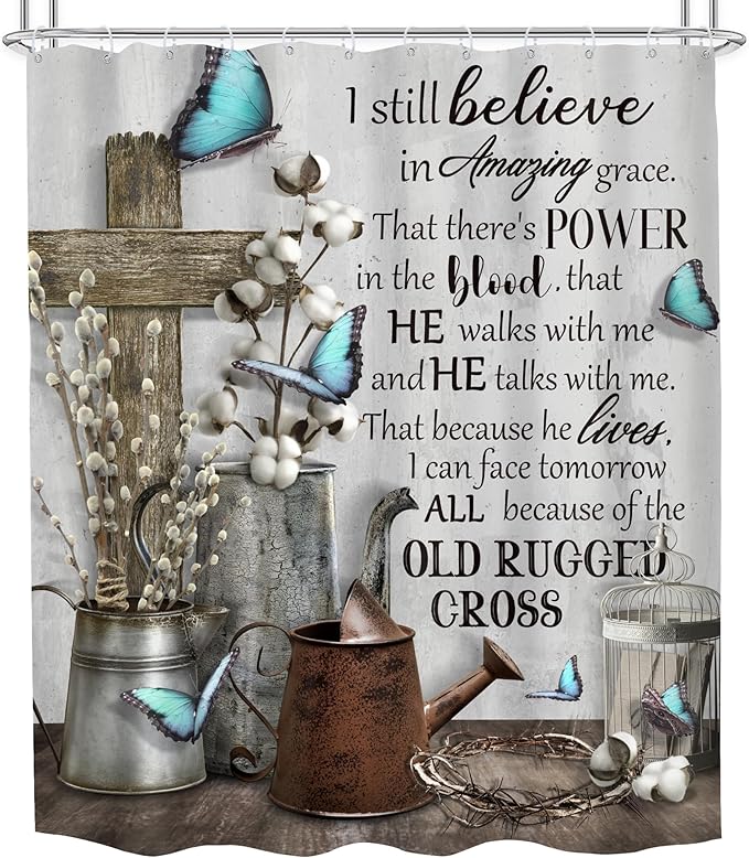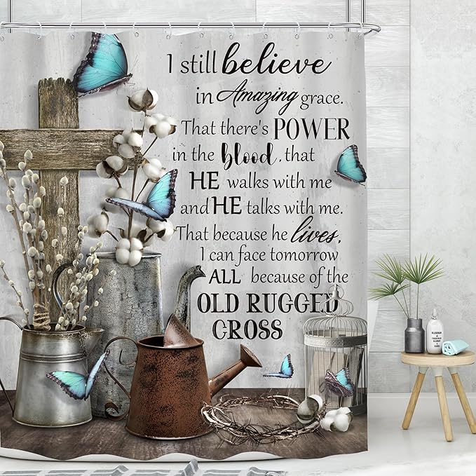 MESHELLY Rustic Farmhouse Christian Shower Curtain 60Wx72H Bible Verse Blue Butterfly Bathroom Curtain Vintage Inspirational Quotes Scriptures Motivational Country Fabric Bathroom Decor with 12 Hooks