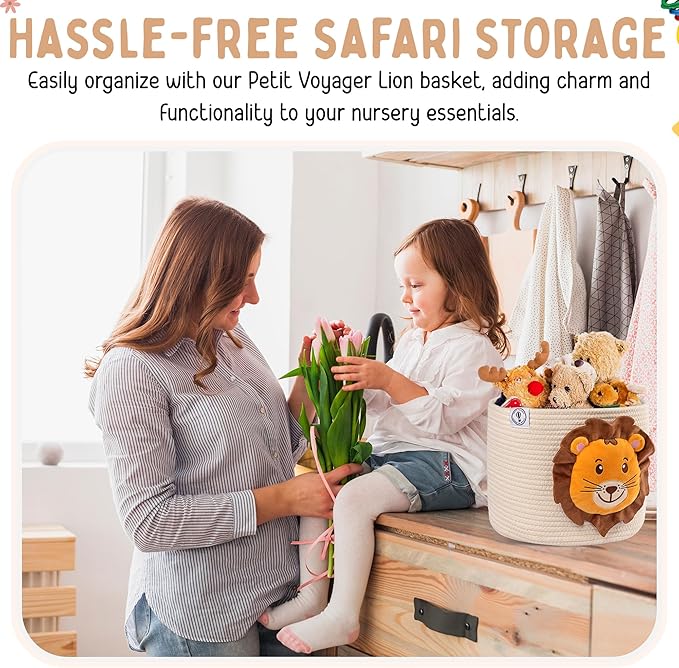 - ENJOY A HASSLE-FREE NURSERY - Transform your nursery into a clutter-free, charming safari adventure with our Petit Voyager lion rope baskets for storage. Perfectly sized for all your baby's essentials, it enhances decor while making room organization effortless and enjoyable.