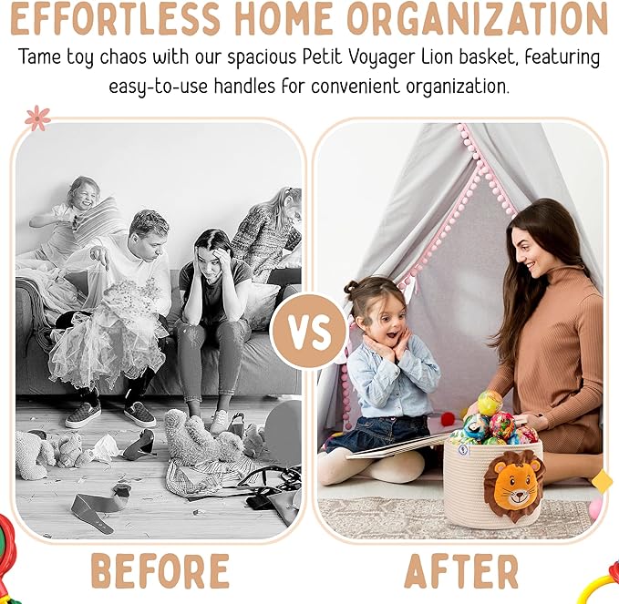 - BUILT FOR CONVENIENCE, DESIGNED FOR STYLE - Combining practicality with aesthetics, our lion storage basket features easy-to-grab handles for effortless transportation. Whether it's for a quick nursery tidy-up or adding a stylish touch to your living space, our baskets for decor deliver functionality with a fun flair.