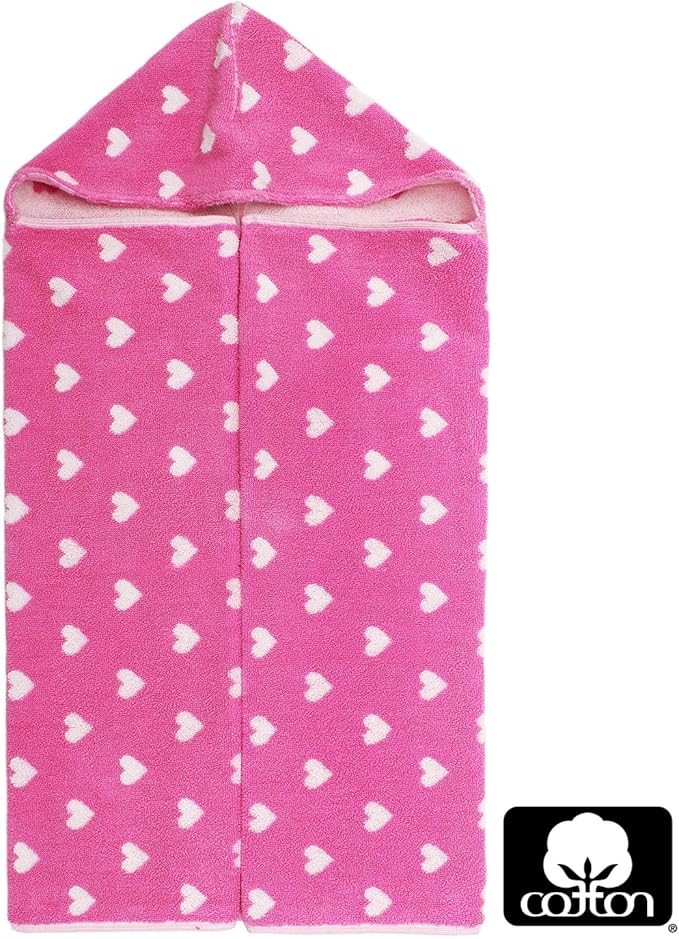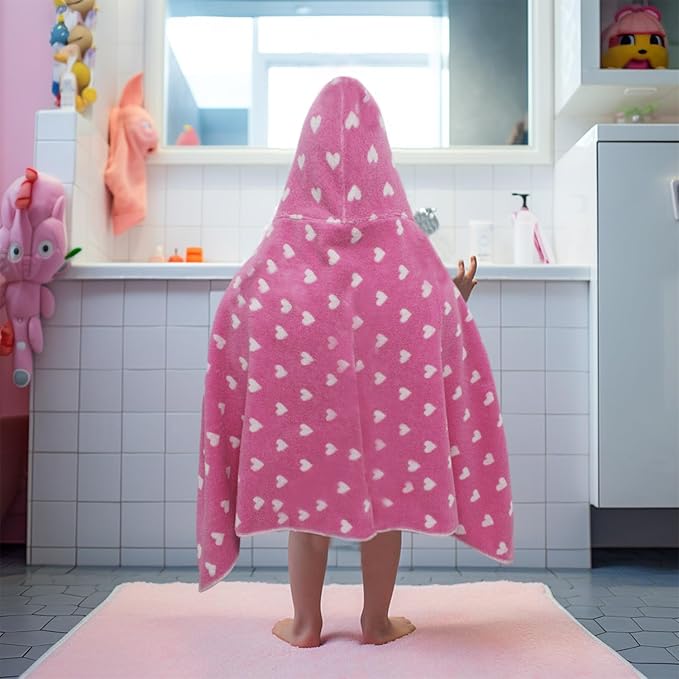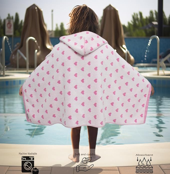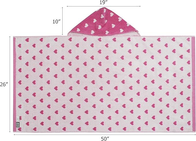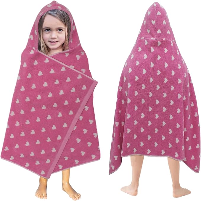 Hooded Bath Towel Wrap - 100% Cotton Jacquard Reversible Large Hooded Hearts Kids Towel - Toddler Shower Pool Beach Towel - Soft Plush Absorbent Quick Dry Easy Care Gift - 26 x 50 - Pink