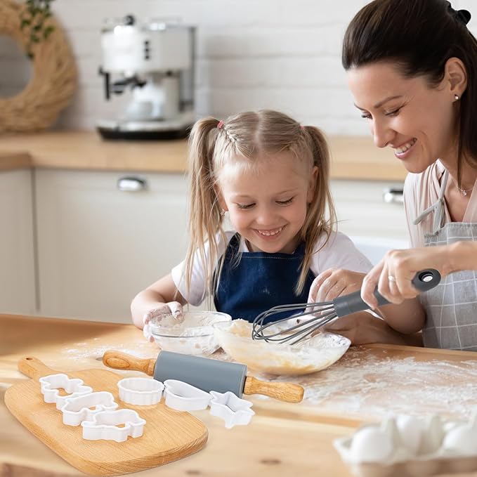 - đ§REAL COOKING SET DESIGN FOR KIDS - This baking set for kids is safe for all ages, protecting our little chef's fingers from cutting. These kids' baking supplies are easy to use. They have convenient handles and soft edges. The kids cutting knives, wooden chopper, and cutting board are designed with rounded tips and edges. The cookie cutters are made of plastic in case the master chef cuts the fingers. Let them enjoy the bakers joy!