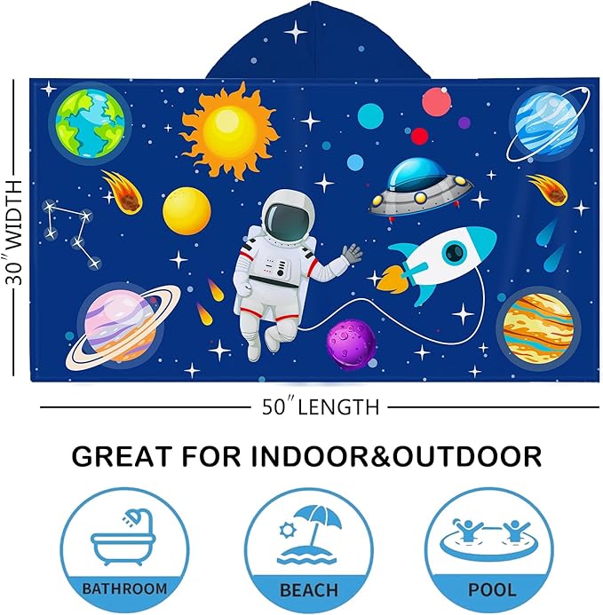 - Multifunctional - Our spaceman towels with hood for kids and little girls can be used at home for bath-time fun, and the spaceman hooded towel can also be used in the beach or swimming pool, protecting your children from catching cold after long water playing, drying quickly and keeping warm with comfortable experience