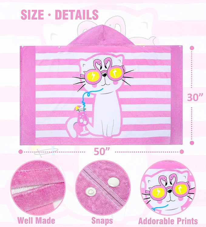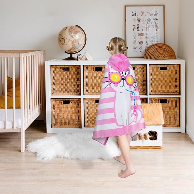 Toddler Bath Towel Hooded - Cotton Kids Beach Towel 30"x50" for Ages 3 to 10, Soft Terry Poncho Towel as Pool Swim Cover Ups for Girls Boys (Cat Pink)