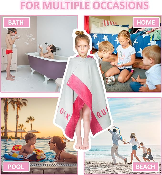 - 【Fully Wraps Around】This kids bath towel is designed with a hood and 2 pairs of snap buttons on the front. This design keeps kids fully wrapped and the towel won't drop off even when they run around. It's great to wrap kids with this wearable poncho towel after bathing and swimming.