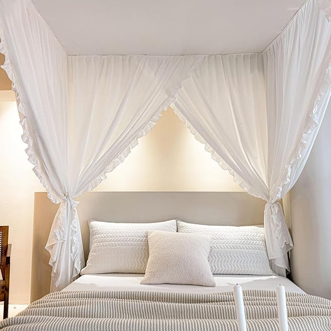 AIKASY Princess Canopy Bed Curtains with Top Ties - Windproof & Lightproof for Girls' Adult Bedroom Decor | Bed Canopy Drapes (Queen,White)