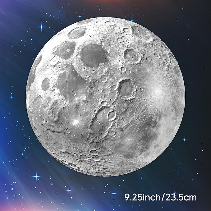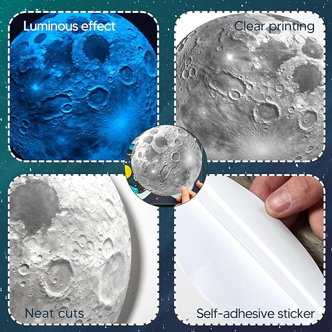 - Robmoda Glow in The Dark Planet - One piece of moon sticker made up of non-toxic, eco-friendly, waterproof, pressure resistant, shock resistant& durable fluorescent PVC. It comes in 23.5 cm (9.25”).