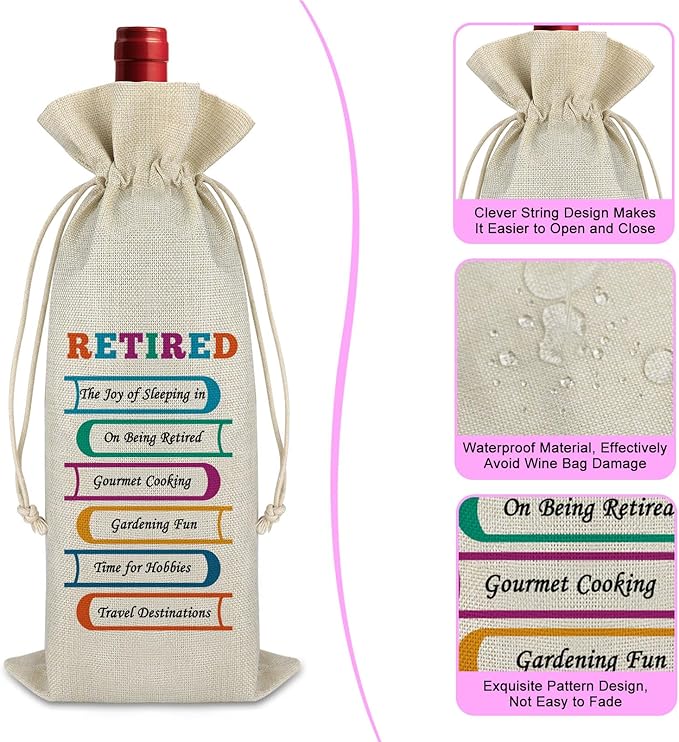- Retirement Gift for Women/Men: The retirement wine bag comes with warming quotes: “RETIRED The Joy of Sleeping On Being Retired Gourmet Cooking Gardening Fun Time for Hobbies Travel Destinations". The retirement gift for family, friends, friends, teacher, colleague, boss, nurse, doctor, manager director superior and elders.