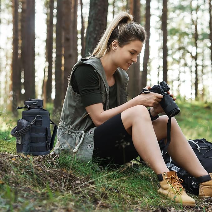 NATURE PIONEOR Tactical Water Bottle with Carrying Molle Sleeve, Stainless Steel 18/8 Food Grade Half Gallon Jug