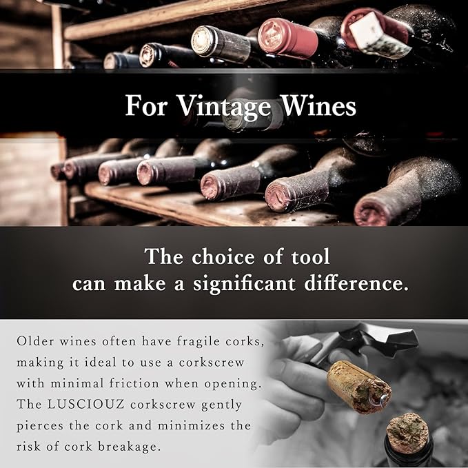 - ✅Ideal for vintage wines When uncorking aged wines, choosing the right wine opener is crucial. Our frictionless dimensional screw smoothly approaches even old and worn corks. It truly shines when dealing with delicate vintage corks that tend to break. Once you experience it, you'll never want to use any other sommelier knife again.