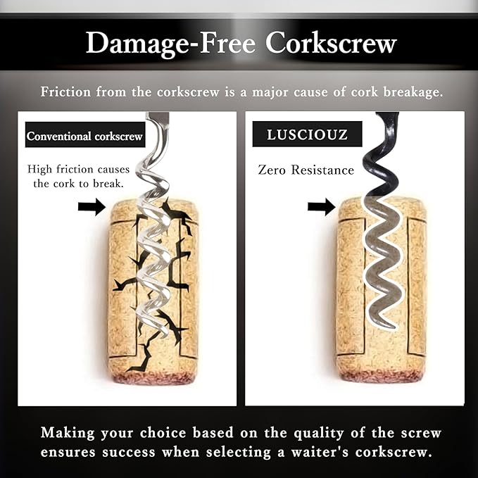 - ✅Next-Level Screw The most crucial component of a sommelier knife is the screw, and we proudly claim that there's no smoother screw than LUSCIOUZ's. It's so smooth that it doesn't even produce friction sounds when removing corks, making it a silent screw that allows you to uncork wines beautifully even in restaurants. This is a professional sommelier knife that sommeliers and industry experts will love.
