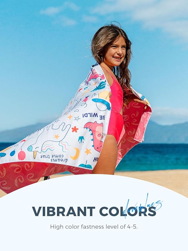 - đKid-Friendly & Colorful: Thanks to digital printing, colors stay vivid wash after wash. Your kids will love our signature double-sided prints and have twice the fun with them. High color fastness level of 4-5. Everyone needs a cute towel, especially kids. They can take their favorite towel to swimming, the beach, camping, hiking, picnics, pool parties, sleepovers, on vacation, and road trips.ïŒNote: Wash before first use for increased softness.ïŒ