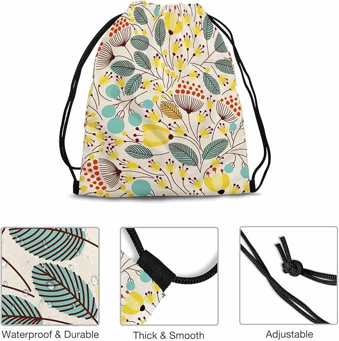 Floral Pattern Beautiful Yellow Flower Green Leaf Red Stamen Drawstring Backpack Gym Backpack Draw String Shoe Swim Back Bag for Women Men 14x16.9 Inch