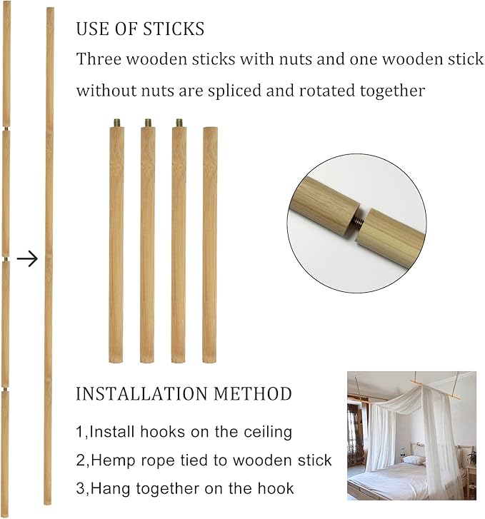 - Easy Setting Up Bed Canopy Curtains King Sized : This bed drapes canopy is quite easy to install! Assembling the Wooden Bed Pole(Wooden poles are equipped with threaded joints, no tools required),Then cut the hanging rope and just fix the bed pole to the ceiling. What you need to do is to simply put the canopy bed drape over the top of your canopy bed frame. Slope this king canopy curtains scarf more or less to adjust the drapery height that you need over the bed. If the scarf is a bit longer