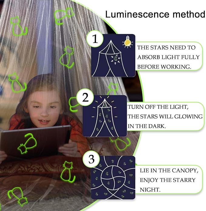 - Glow in the Dark Magic: Our canopy works as follows, the indoor lights are turned on to illuminate it in the evening, and when it's time to sleep, the lights are switched off, and the product emits a gentle greenish glow, accompanying children as they drift into slumber; As you and your child settle down for a peaceful sleep, the cats dim gradually, creating a soothing ambiance that ensures a restful night's rest