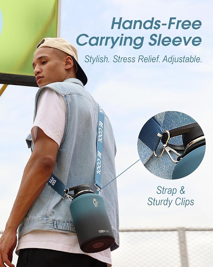 - Unleash Your Style, Hands-Free: Elevate your fashion game with this half gallon water bottle's exquisite adjustable shoulder straps and eye-catching design. Whether worn crossbody, single-shoulder, or hand-held, it's a statement piece that complements your vibrant personality.