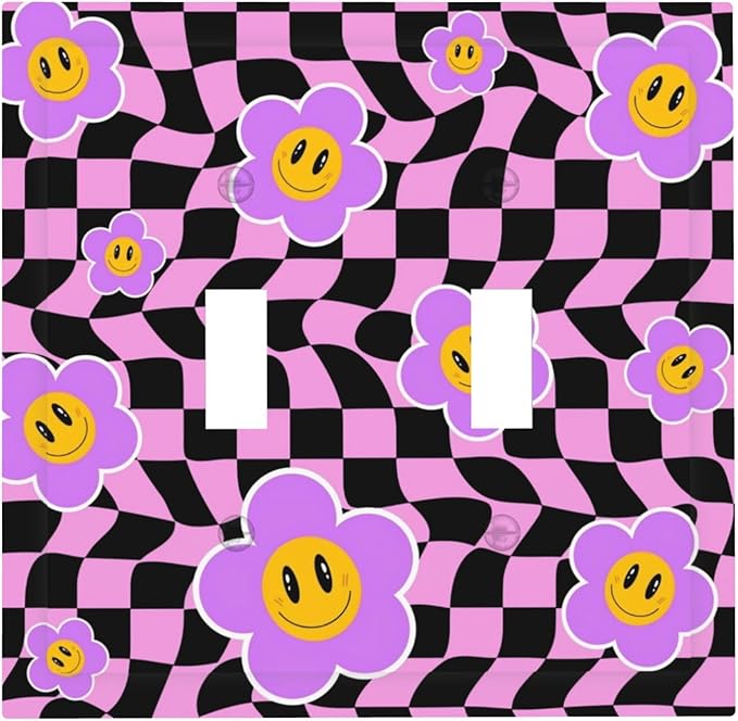Flowers with Checkered Double Toggle Light Switch Covers 2 Gang Wall Plate Dual Decorative Switchplate Electrical Faceplate for Bathroom Country Kitchen Bedroom Decor, 4.9" x 5"