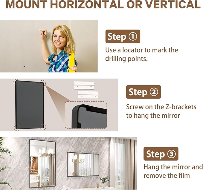- 【Easy Sturdy Installation】The bathroom mirror with hanging design on the frame back to hang horizontally or vertically. Super easy to install with Z-bar sturdy wall bracket, ensures the mirror rests more securely against the wall. (Hardware included);