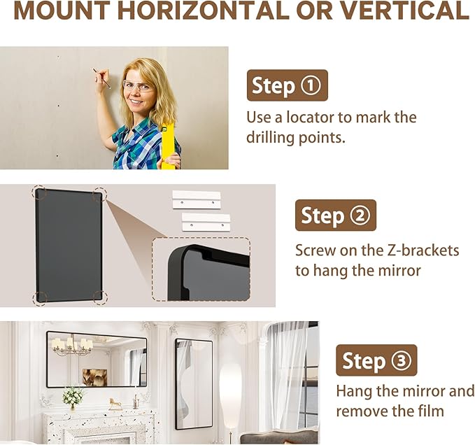 - 【Easy Sturdy Installation】The bathroom mirror with hanging design on the frame back to hang horizontally or vertically. Super easy to install with Z-bar sturdy wall bracket, ensures the mirror rests more securely against the wall. (Hardware included);