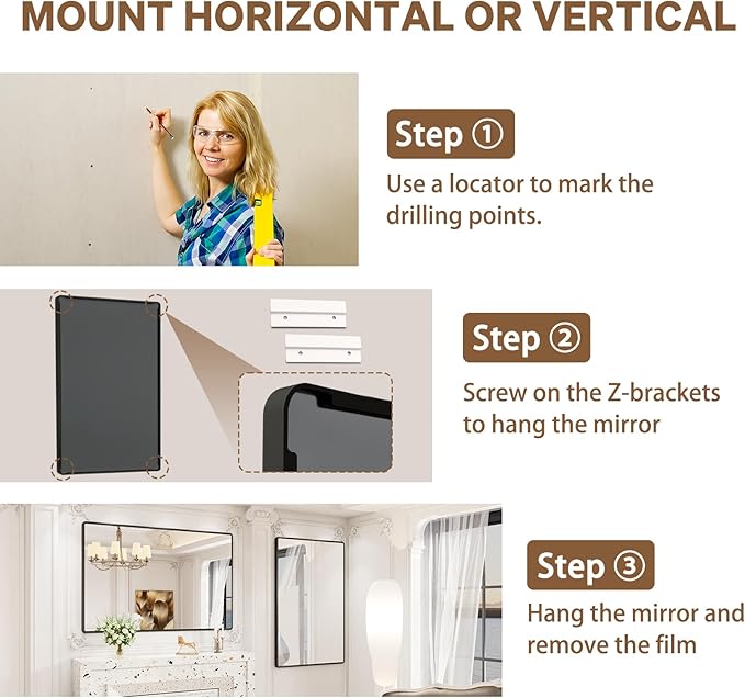 - 【Easy Sturdy Installation】The bathroom mirror with hanging design on the frame back to hang horizontally or vertically. Super easy to install with Z-bar sturdy wall bracket, ensures the mirror rests more securely against the wall. (Hardware included);