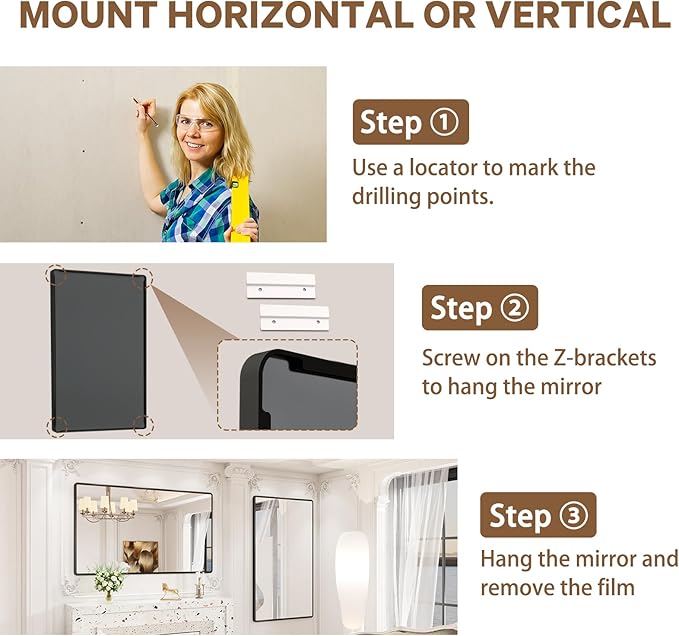 - 【Easy Sturdy Installation】The bathroom mirror with hanging design on the frame back to hang horizontally or vertically. Super easy to install with Z-bar sturdy wall bracket, ensures the mirror rests more securely against the wall. (Hardware included);