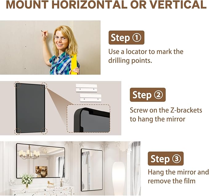 - 【Easy Sturdy Installation】The bathroom mirror with hanging design on the frame back to hang horizontally or vertically. Super easy to install with Z-bar sturdy wall bracket, ensures the mirror rests more securely against the wall. (Hardware included);