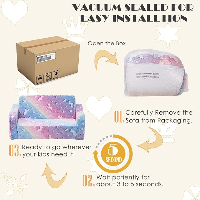- ✿【VACUUM SEALED FOR NO INSTALLTION REQUIRED】➤ The toddler sofa couch is in vacuum packing. Simply unbox it and wait patiently for about 3-5 seconds, then you will get a soft plush Sofa for your kids. Premium quality foam allows immediately expansion without needing long time waiting for 24 hours or more. A THREE-YEAR WARRANTY is offered against manufacture's defect