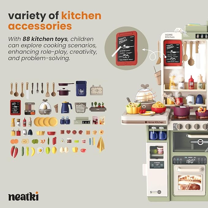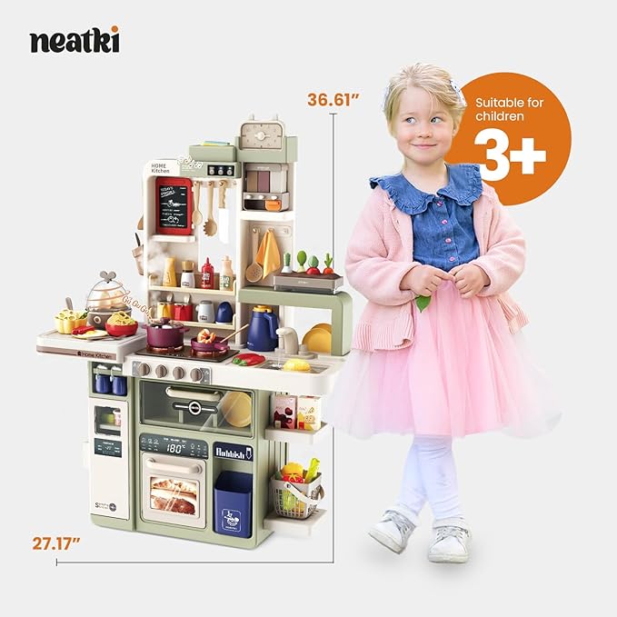 88-Piece Kids Kitchen Playset: 27.16 x 10.62 x 36.61 Inches, Interactive Features, Realistic Design, and Educational Fun for Ages 3 and Up (Avocado Ash 88)