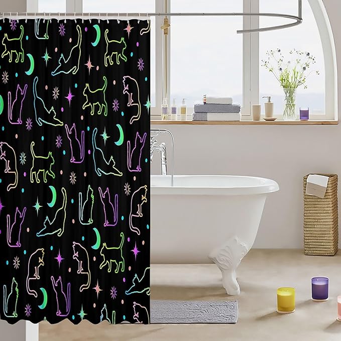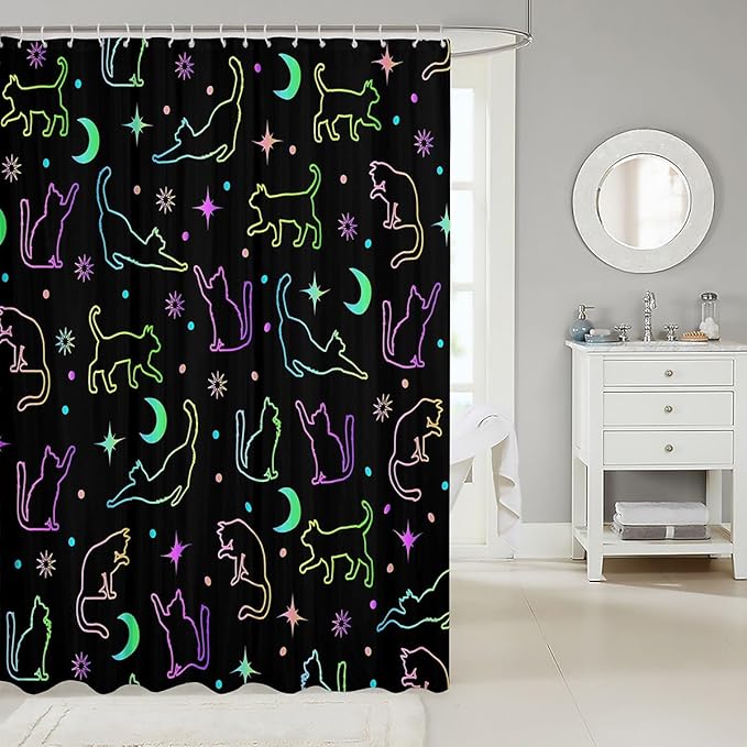 Cute Cats Silhouettes Kids Shower Curtains,Sun Moon Starry Sky Outer Space Bathroom Curtains for Girls Boys,Cartoon Pets Animals Colorful Bright Waterproof Curtains,12 Hooks Suits,72"W x 72"L