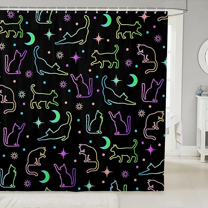 Cute Cats Silhouettes Kids Shower Curtains,Sun Moon Starry Sky Outer Space Bathroom Curtains for Girls Boys,Cartoon Pets Animals Colorful Bright Waterproof Curtains,12 Hooks Suits,72"W x 84"L