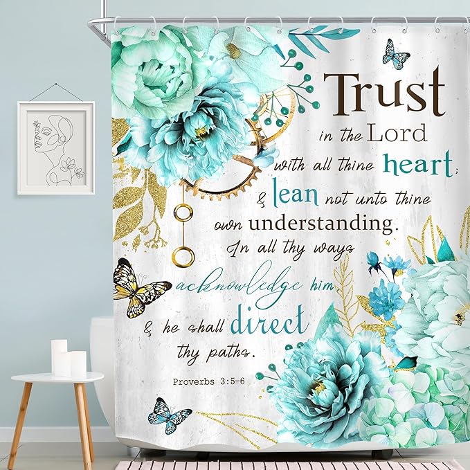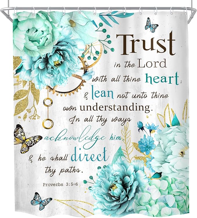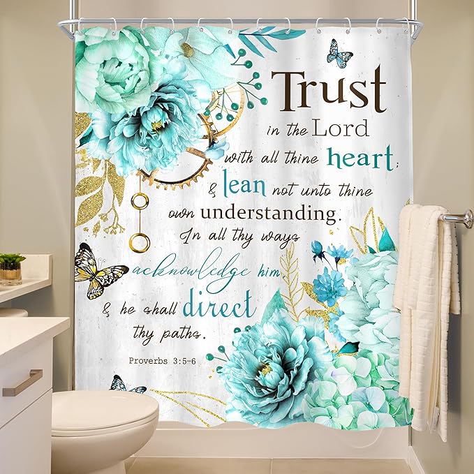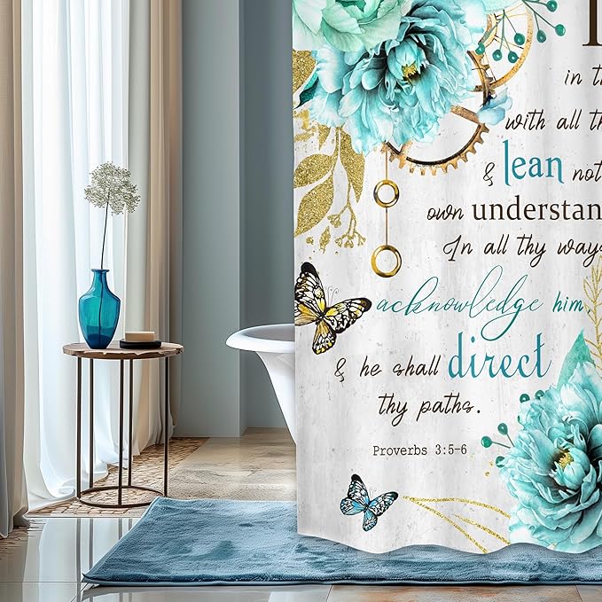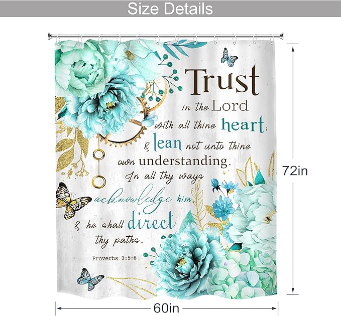 MESHELLY Teal Shower Curtain 60Wx72H Flower Christian Shower Curtain Farmhouse Bible Verse Rustic Blue Floral Shower Curtain Women Inspiration Quote Scriptures Bathroom Decor Fabric with 12 Hooks