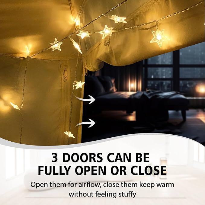 - Breathable Unstuffy: The 3 double-sided zippered doors of the bed tent can be fully opened for ventilation. when you closed 3 doors, the mesh on both sides promotes air circulation, keeping you warm without feeling stuffy.