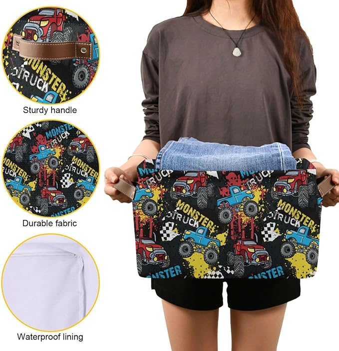 Monster Truck Black Red Blue Storage Basket Fabric Toy Baskets Racing Cars Boys Open Home Storage Bins Boxes Foldable Organizer Bag for Toy Book Shelf Closet Baskets 16×12×8 Inches
