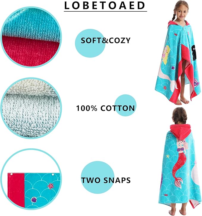 - 【MORE FRIENDLY DESIGN for KIDS】: Our baby bath & hooded towel has two snaps on the side to help you wrap your child up in comfort and playful style.This surf poncho is easy to put on and off, and will not slide down from body.The hood can helps dry your child's hair. We have many cute cartoon styles suitable for boys & girls like Dinosaur, Mermaid, Cat, Unicorn, Shark, Car, Narwhal...