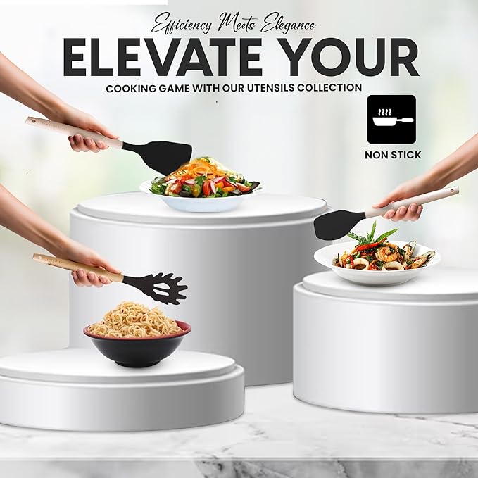• Non-Stick and Easy to Clean: The silicone utensils are non-stick and easy to clean. They are stain-resistant and won't retain odors or flavors. The wooden handles are easy to wipe clean and can be washed in the dishwasher.