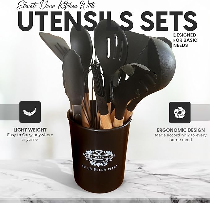 Silicone Utensil Set, 12 PCS Wooden Handle Nontoxic BPA Free 100% Food Grade Silicone Spoon Spatula Ladle Turner Tongs Kitchen Gadgets Utensil Set for Nonstick Cookware (Black)