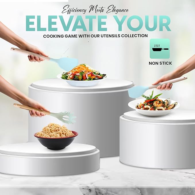 • Multi-Functional Design: The silicone utensils are versatile and can be used for a variety of tasks in the kitchen. They are ideal for cooking, baking, serving, and mixing. The set includes tools for both wet and dry ingredients, making it convenient to use for different recipes.