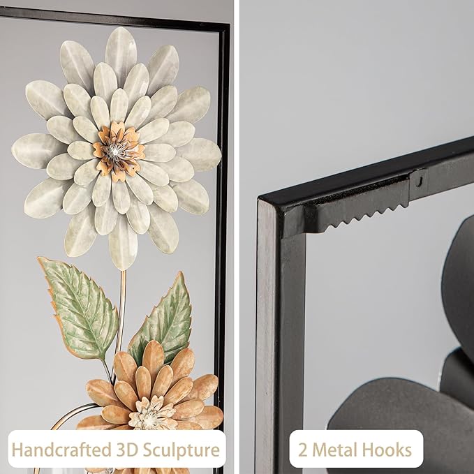 - Two 3D metal flower blooms in gray or brown with 4 green leaves in different sizes framed by black rectangular frame create this luxurious wall art that glams up your home decor instantly. Intricate leaves with vein detail and irregular edges along with golden iron branches enhance that authentic natural look and showcase refined craftsmanship.