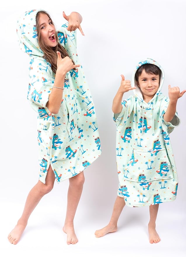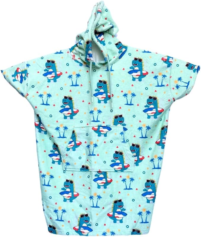 Cotton/Microfiber Kids Surf Poncho, Wetsuit Changing Towel Bath Robe with Hood and Pocket for Ages 3-7 and 8-12 (Surfer Dinos, 8-12 Years)
