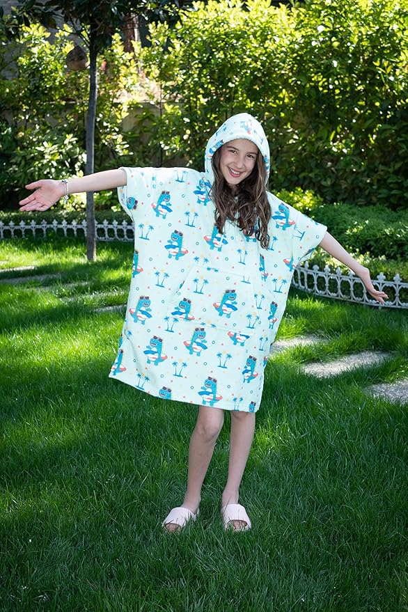 Cotton/Microfiber Kids Surf Poncho, Wetsuit Changing Towel Bath Robe with Hood and Pocket for Ages 3-7 and 8-12 (Surfer Dinos, 3-7 Years)