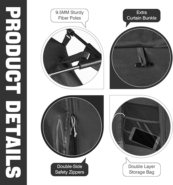 - EXCELLENT CUSTOMER SERVICE: The queen bed tent comes with a double storage bag, which is convenient for you to put other items such as cell phones and books, and also keep your tent tidy. The set includes 1 queen size bed tent, 2 fiber poles with plastic elbows, 4 long fiber poles, and 1 storage bag. The portable bed tent is perfect for bedrooms, dorms, traveling, sibling's rooms, or partners who need to sleep during the day. May our tent be your best choice! Our goal is to serve every customer.