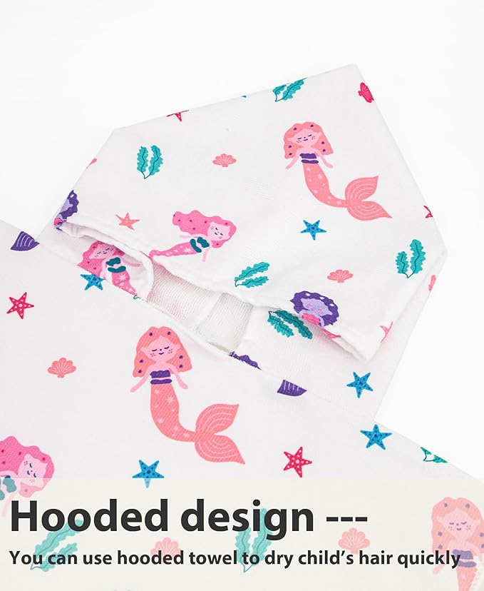 - [EXCELLENT DESIGN] The pullover design of the hooded beach towel is not easy to slip off. Sharks, stars, mermaids, flamingos and other cartoon patterns in line with children's preferences, Cartoon printing to make the poncho towel more colorful to cultivate children's perception of color