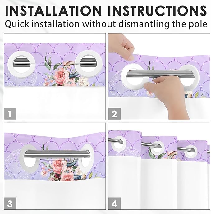 - [ No Hook Shower Curtain Set ]: Install in 20 seconds without the hassle of annoying and messy hooks, and no need to remove the rod! Made from 100% polyester,our shower curtain is not only waterproof and stain-resistant but also dries quickly.
