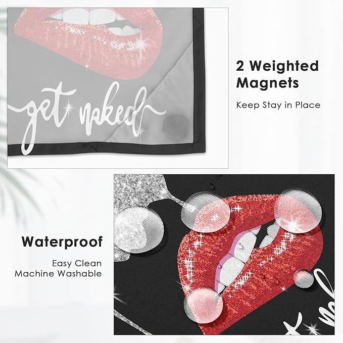 Red Lips No Hook Shower Curtain with Snap in Liner, Diamond Glitter Get Naked Black Bath Curtain with Double Layers Waterproof Fabric and Mesh Top Window 71x74 Inch