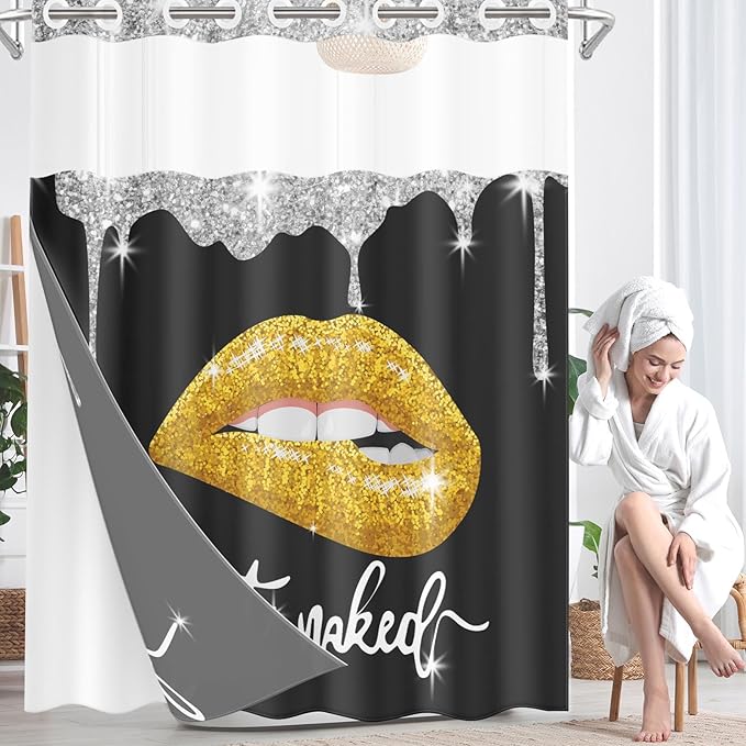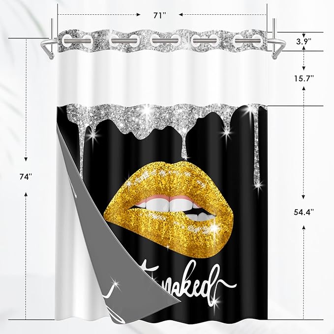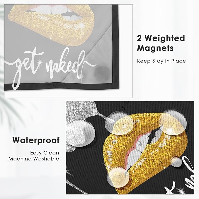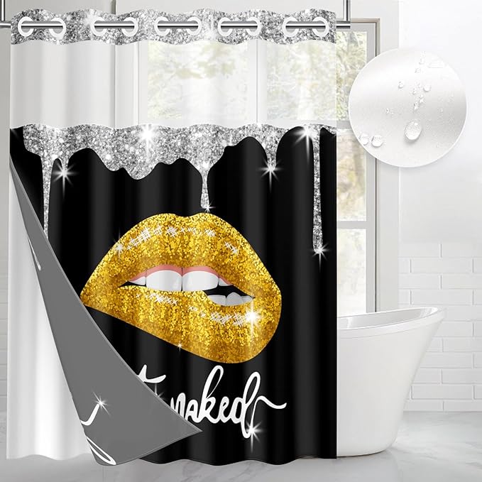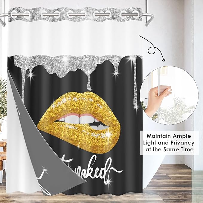 Yellow Gold Lips No Hook Shower Curtain with Snap in Liner, Diamond Glitter Get Naked Black Bath Curtain with Double Layers Waterproof Fabric and Mesh Top Window 71x74 Inch
