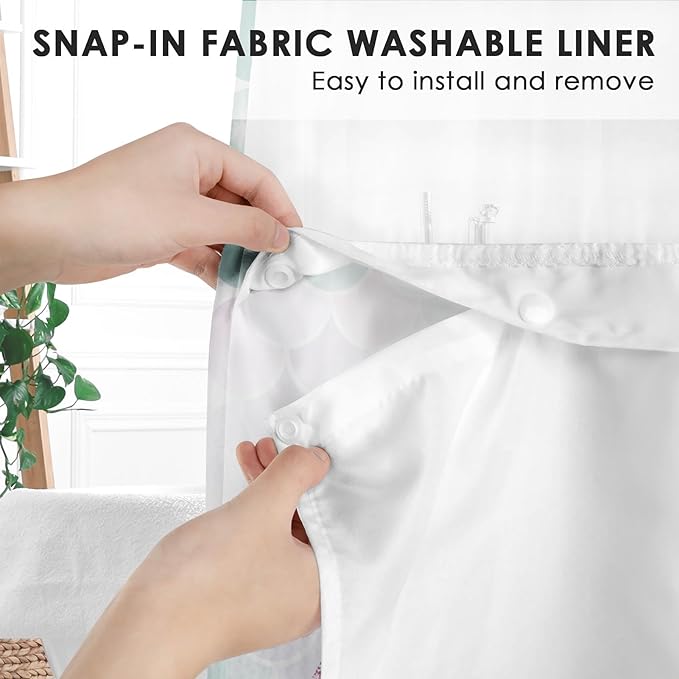 - [ Hotel & SPA ]:This no hook shower curtain is hassle-free due to detachable liner and built-in grommets, no need to remove shower rod, easy hang, self hanging shower curtains save time & money.