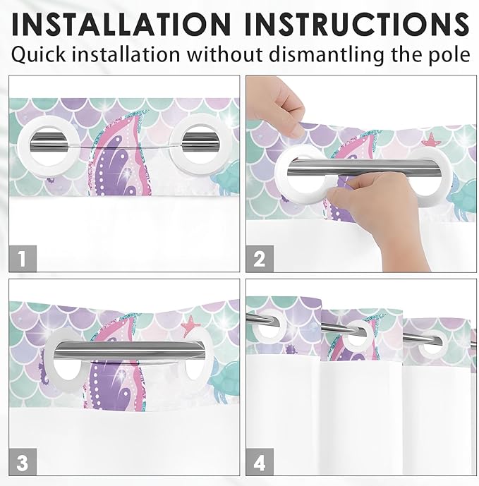 - [ No Hook Shower Curtain Set ]: Install in 20 seconds without the hassle of annoying and messy hooks, and no need to remove the rod! Made from 100% polyester,our shower curtain is not only waterproof and stain-resistant but also dries quickly.