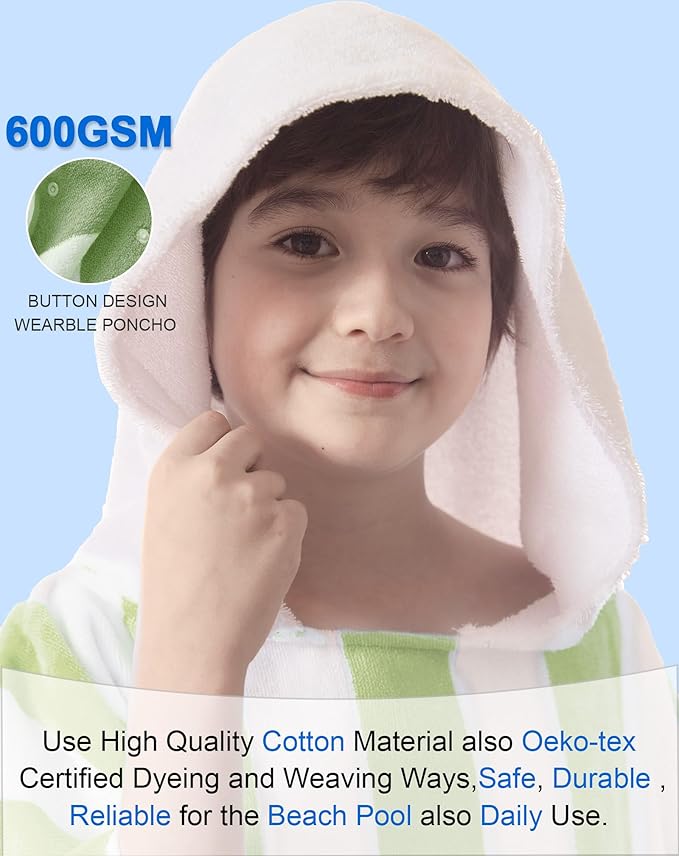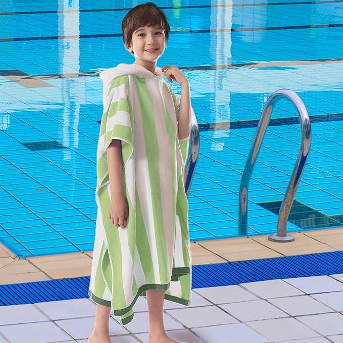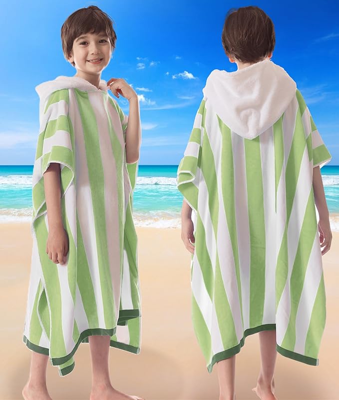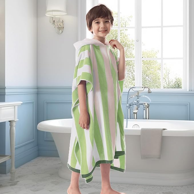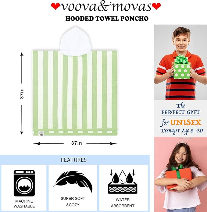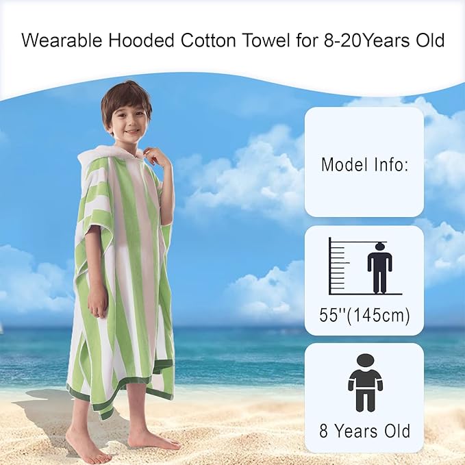 VOOVA & MOVAS Big Kids Hooded Towel Poncho | Large, Thick, Absorbent Cotton Towel Robe | 8-16Years | Versatile for Pool, Swim, and Bathroom | Sage and White Cabana Stripe