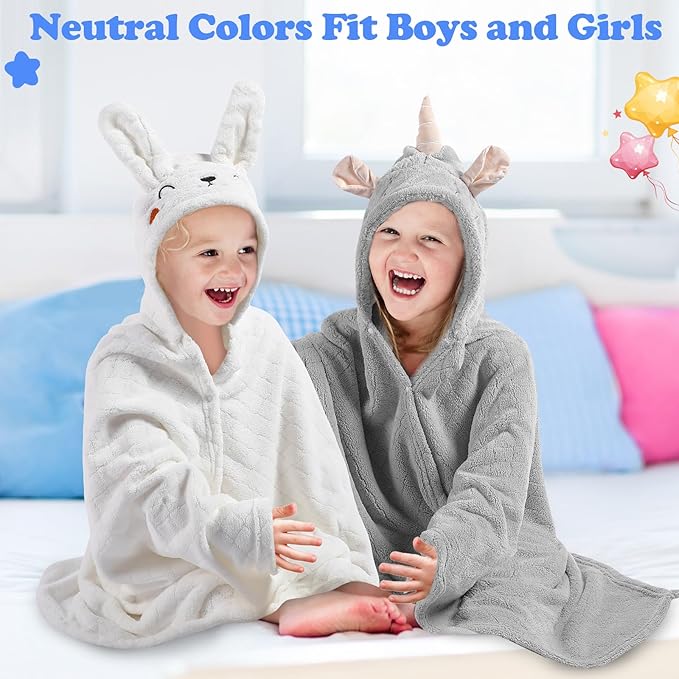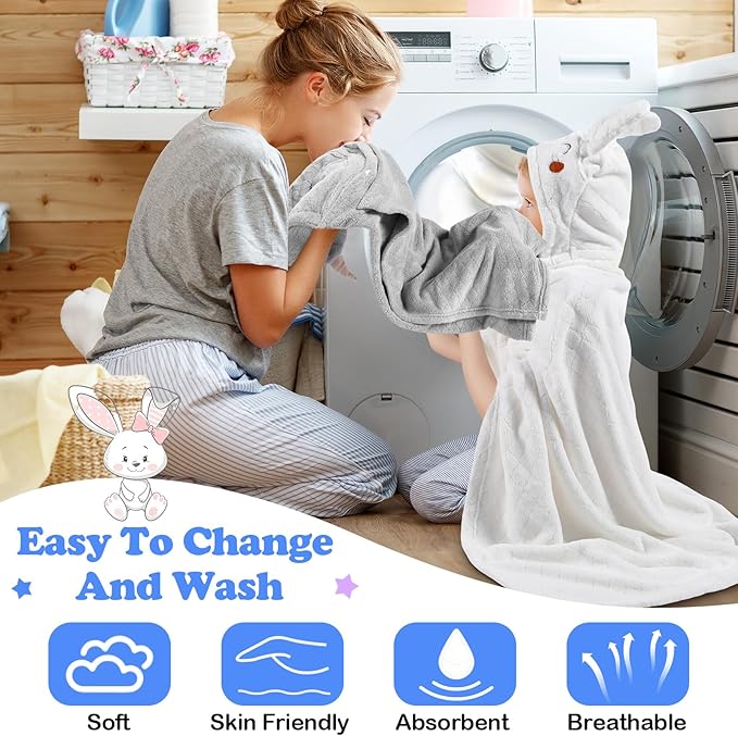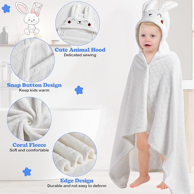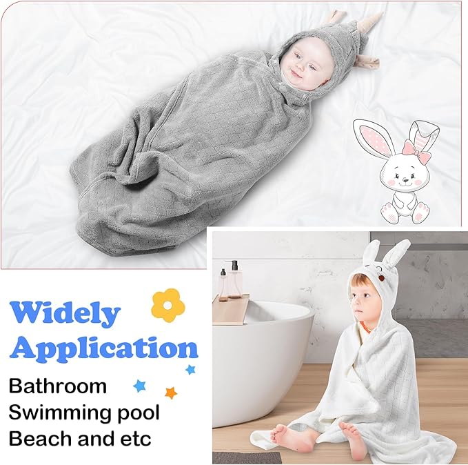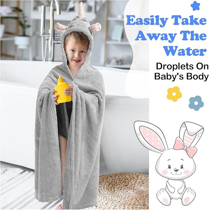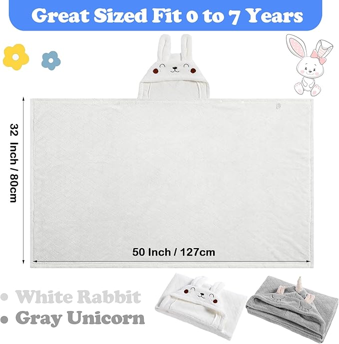 - Cute Hood Design: the hood of each toddler bath towel is designed with cute animal patterns, namely white rabbit and gray unicorn; The cute hooded can not only absorb water from your child's hair, keeping it warm and dry, It can also add fun to your child's bath time