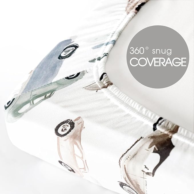 GRSSDER Pack n Play Sheets Fitted 2 Pack, Stretchy Ultra Soft Jersey Knit Pack and Play Sheets, Universal Fitted Portable/Mini Crib Mattresses Snug and Safe, Neutral Pattern of Cars Print